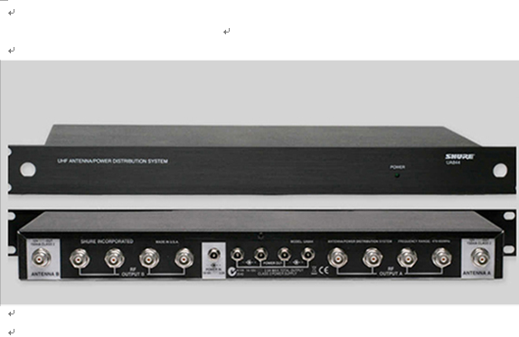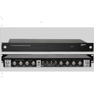 舒爾UA844+天線分配系統可將一對天線分頻至多臺接收機,達到擴展無線話筒系統的目的。UA844+還可放大射頻信號,補償因信號功率被分至多個輸出而造成的插入損耗。單個UA844+系統可支持五個無線接收機。雙層配置中可使用五個UA844+系統。